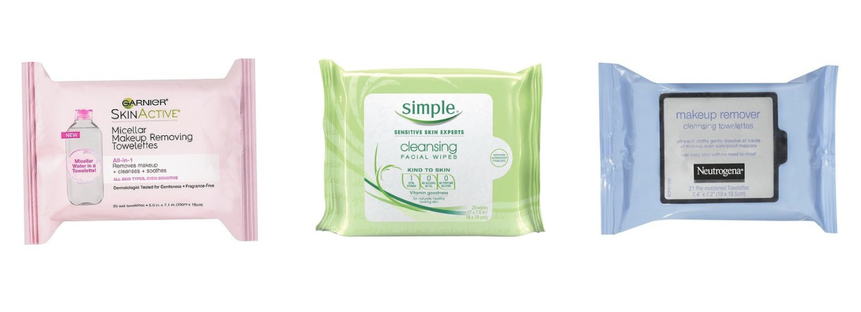 Products: Garnier SkinActive Micellar Wipes – Target | Simple Cleansing Facial Wipes – Walgreens | Neutrogena Makeup Remover Cleaning Wipes – Ulta