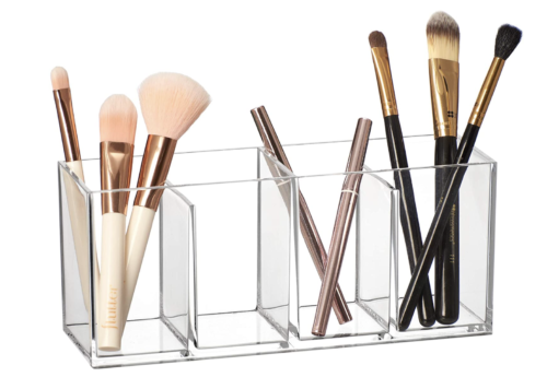 For makeup brushes, I love the look of this clear makeup organizer for your counter. It is both aesthetically pleasing and functional for sorting out all your makeup tools.