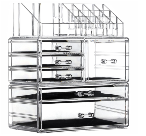 If you have a lot of drawers in your bathroom or desk, these clear acrylic bins will keep everything organized. This set comes with 17 individual storage bins that can be used separately or stacked and can customize to fit in any layout.