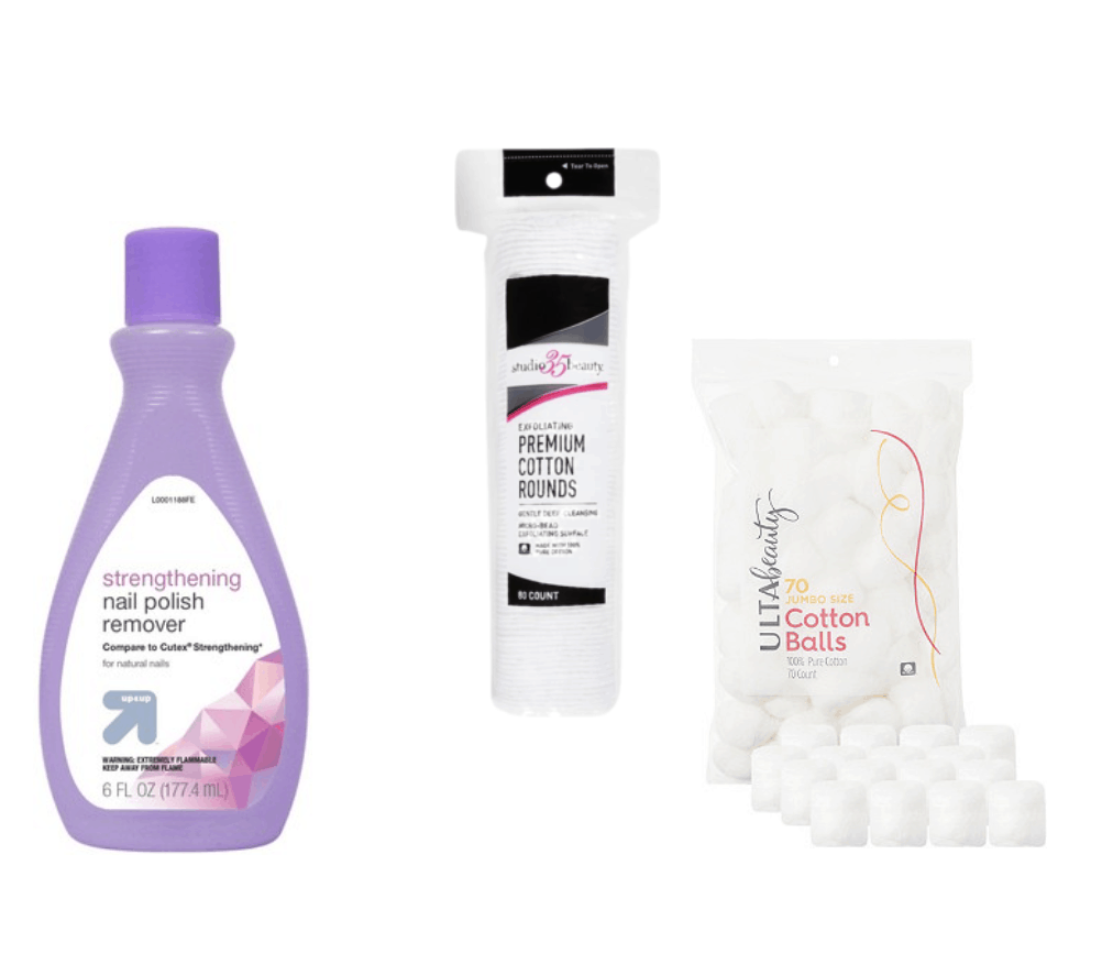 Products: Up and Up Strengthening Nail Polish Remover, Studio 35 Cotton Rounds, Ulta Jumbo Cotton Balls