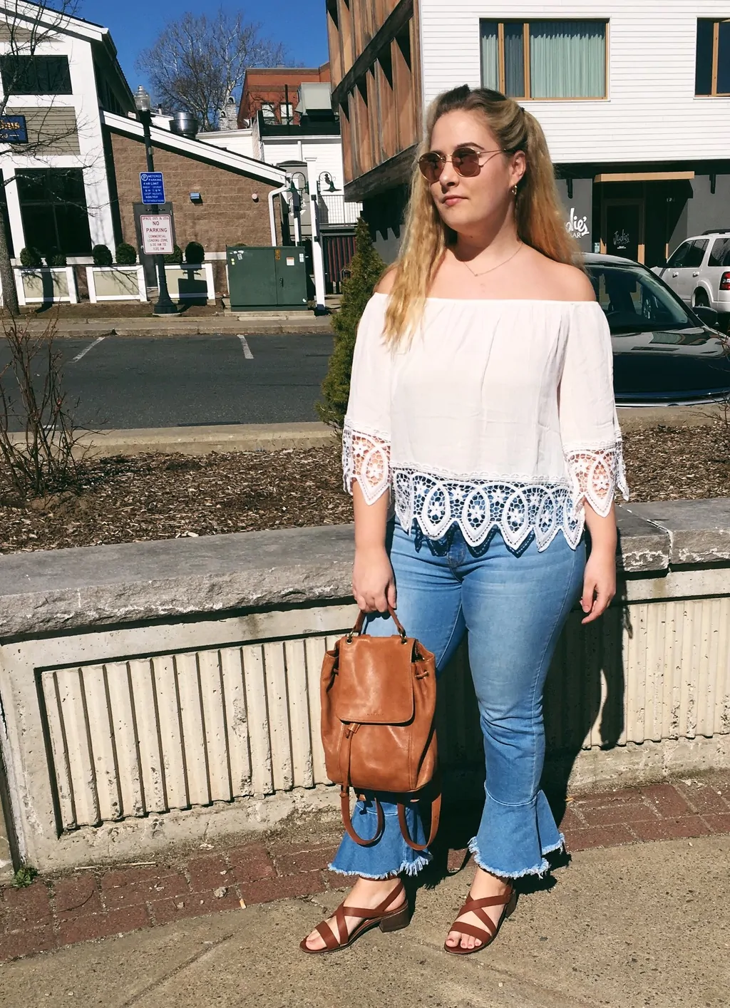 University of Massachusetts Amherst student Kendall wears a cream off-the-shoulder bohemian top with lace detailing on the sleeves and hem with high-waisted light-wash denim cropped flare jeans, a leather bucket backpack, and brown leather strappy sandals with chunky heels.