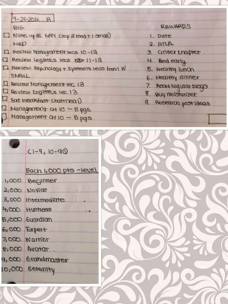 I’d add those daily points on top of my semester cumulative total, goal being to reach 10,000 points by the end of the semester. Like Habit Judo’s judo belt system where you level up at certain point levels, I gave myself target levels to hit every 1,000 points. I didn’t reward myself for every level I hit, unlike my previous gamification system (see: Play below). For fun, I gave the levels names correlating to shows/books I enjoy (e.g. Level 4: huntress to correspond with RWBY).