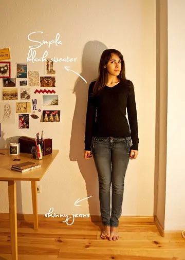 For instance, here I chose my favorite pair of jeans (which are super comfortable and go with everything) and a simple v-neck sweater, since it is quite cold outside. This is my sleek, blank canvas.