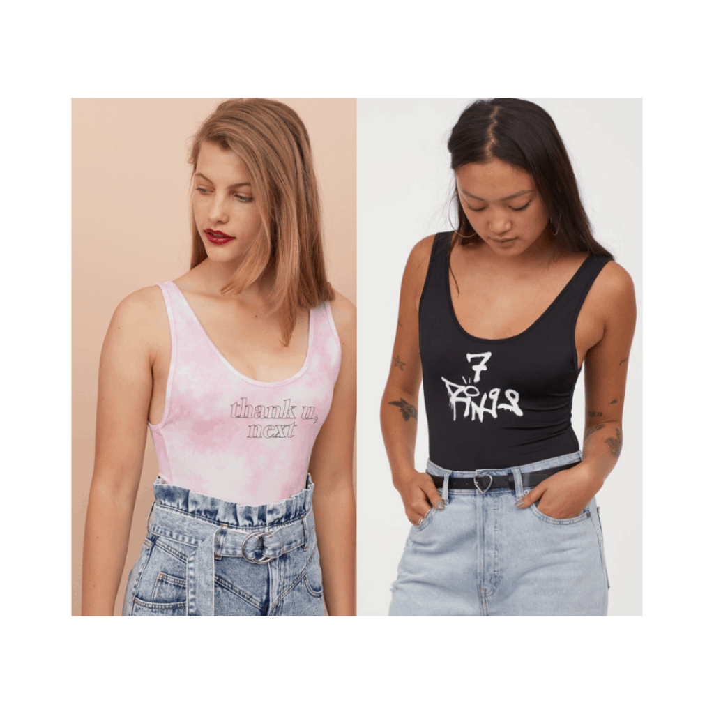Products: Pink ‘thank u next’ bodysuit – H&M, black ‘7 rings’ bodysuit – H&M