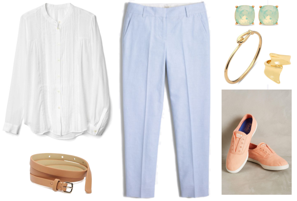 Begin with a white blouse with beautiful lace detailing, and tuck it into a pair of pale blue pants. (Note: Wear the blouse over a camisole, as the lace may show some skin in a way that isn’t work-appropriate.) Add a soft neutral-colored belt to pull the outfit together.