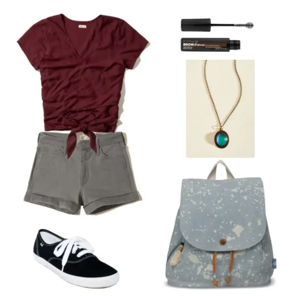 Products: Shirt – Hollister, Shorts – Hollister, Shoes – Macy’s, Backpack – Toms, Necklace – Modcloth, Brow Gel – Maybelline