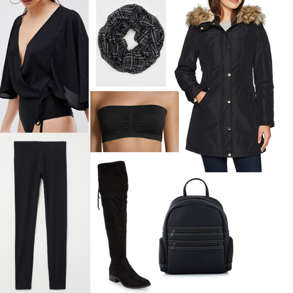 Products: Cape top – ASOS, Elastic Pants – H&M, Over the Knee Boots – Lord & Taylor, Scarf – Ardene, Bandeau – JCPenney, Backpack – JCPenney, Winter Coat – Amazon.