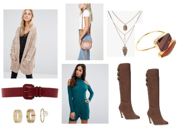 Products: Cardigan, Romper, Belt, Purse, Boots, Necklace, Rings, Bracelet