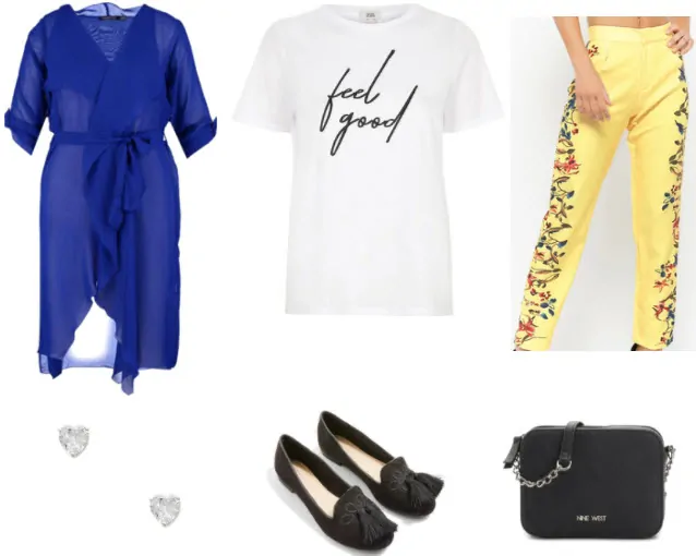 This set has the best Spring colors. There’s some yellow, cobalt blue, and pink, all of which work together to make this outfit pop. The floral pants from Forever 21 are a great budget-friendly way to try this trend. Adding Boohoo’s cobalt duster is another bold touch that’s perfect for spring weather.