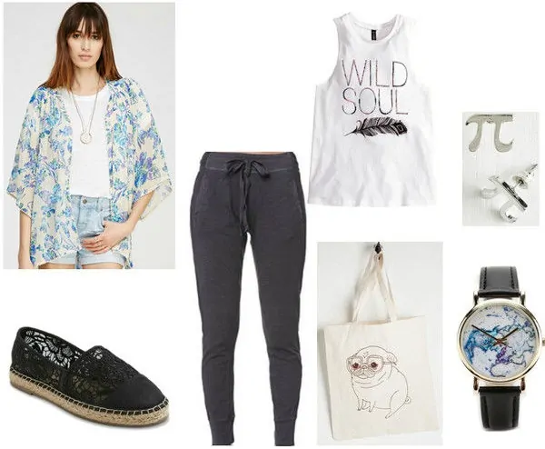 During the day, let your kimono act as an accessory to a casual outfit. Pair a graphic tank top with comfy jogger pants, then slip on these lacy espadrille flats. Fun jewelry, like these pi-shaped earrings and this watercolor watch, are simple but pretty accents to your outfit. Fill this adorable tote with your books, then head to your classes in style!