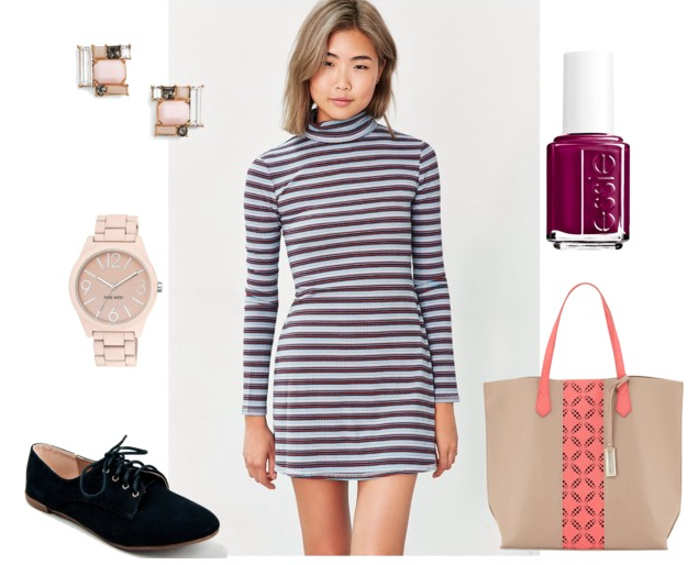 Now let’s accessorize. This dress pairs well with some black lace-up oxfords and a large beige-and-pink tote. Paint your nails a nice deep plum color to ease yourself into the fall vibe.
