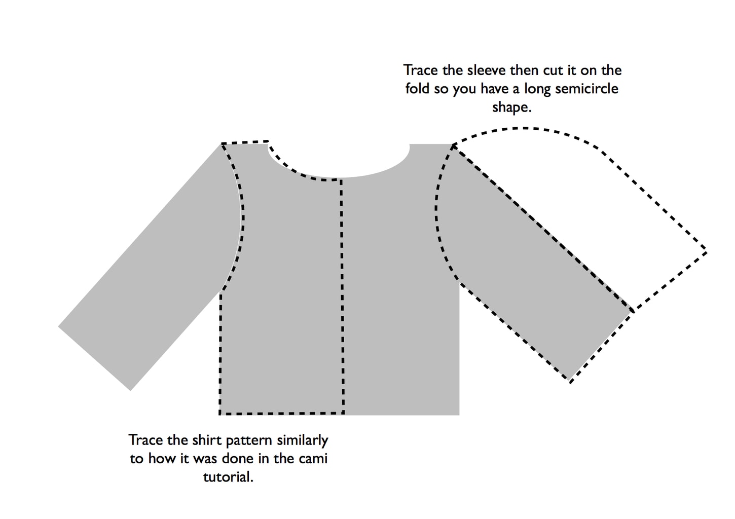 First you’re going to cut out the body of the sweatshirt by copying one you already own. Fold the sweatshirt in half and trace it on the fold, like in the cami pattern from our cami tutorial. Don’t forget to add seam allowance! Then do the same for the sleeves. Trace around the armhole to create a curved shape like in the diagram above.