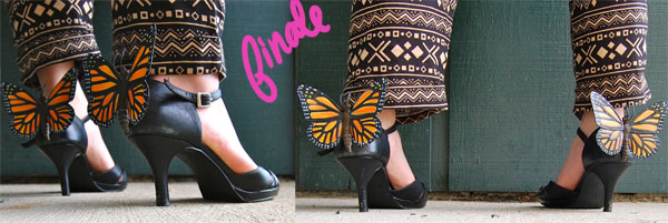 Let dry. Make sure that the “drying” position that you put the shoe in allows the butterfly to be parallel to the ground, or else it’ll fall off or the position will be skewed. I actually hooked the back of the shoe onto the legs of a folding-chair flipped sideways.