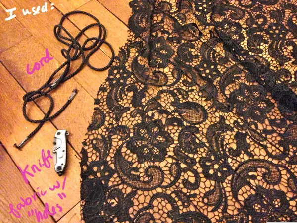 - Cord or ribbon (I simply repurposed material from this DIY); the diameter must be small enough to loop through the holes of the fabric.