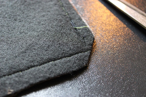 Before turning your bag right side out, cut off the corners just below the sewn lines and make small snips along the sides of the clutch without cutting into the seams.