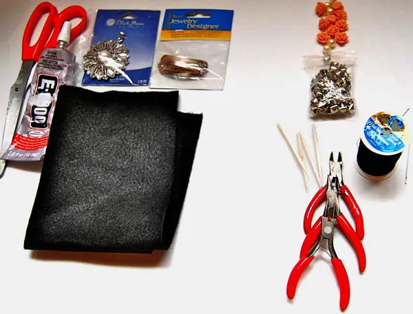 • Optional (shown on right):additional embellishments (studs, pearls, roses), needle+thread, jewelry pliers, toothpicks