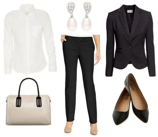 Other things to remember? Stick to neutral colors, low heels or flats, simple blouses, and understated jewelry. (For more guidelines, see here.)