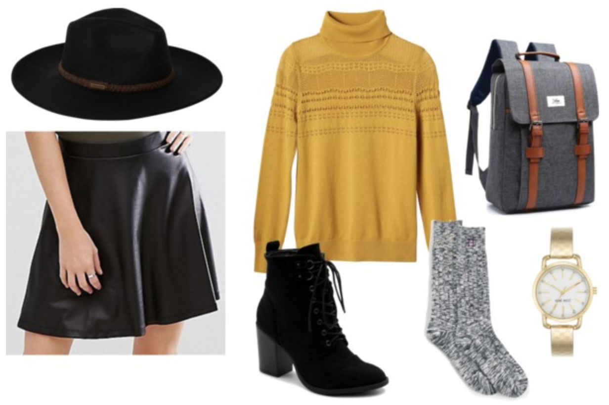 This look has a trendy street-style vibe, but is still totally appropriate for the average day of classes. It starts with a comfy mustard turtleneck, which is dressed up by a faux leather skater skirt.