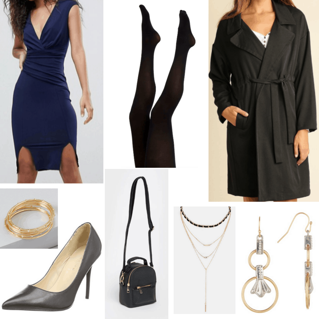 Products: Dress – ASOS, Pumps – Amazon, Layered Necklace – Ardene, Earrings – Nordstrom Rack, Bracelets – Lane Bryant, Winter Coat – Shoptiques, Crossbody Purse – Ardene, Tights – Forever 21.