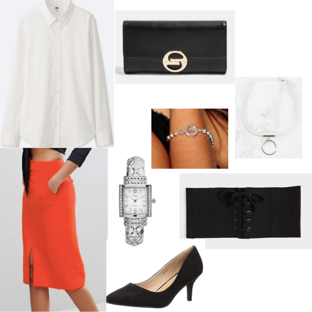 Products: Pencil Skirt – ASOS, Pumps – Amazon, Blouse – Uniqlo, Belt – Aldo, Necklace – NA-KD, Bracelet – Boohoo, Watch – Kohl’s, Clutch – TopShop.