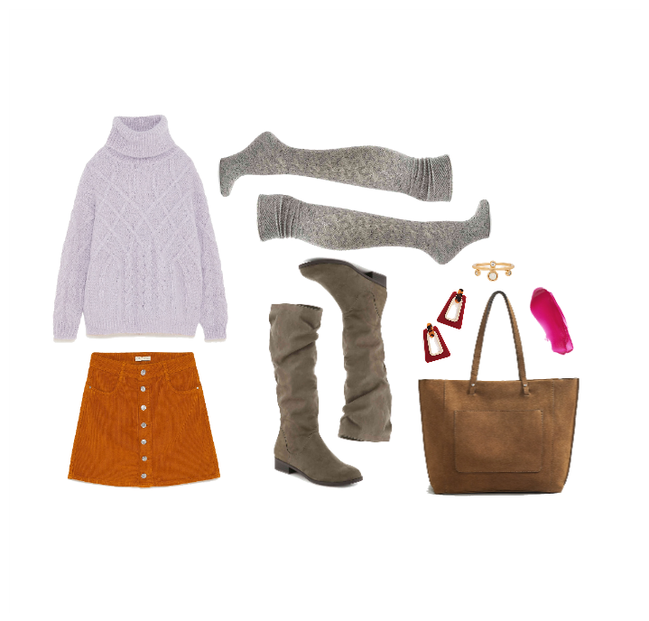 To start, put on an oversized lavender turtleneck sweater. Next, add a burnt-orange button-front corduroy skirt for some cool contrast in both color and texture.