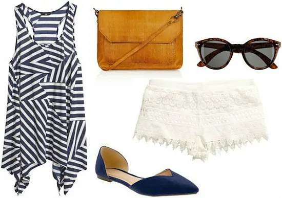 Inspired by this outfit from Life, Love and the Pursuit of Shoes, this ensemble features a play on texture and shape that creates visual interest without adding unnecessary weight and bulk. I love the idea of lace shorts peeking out from beneath a longer top with an interesting hem, and the combination of navy blue, white and cognac looks crisp and fresh for summer.