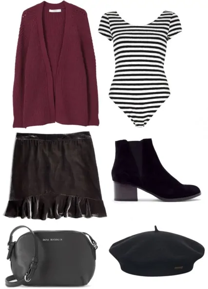 Products: Sweater – Mango, Bodysuit – River Island, Skirt – Madewell, Boots – Newlook, Purse – Kohl’s, Beret – Surf Stitch.