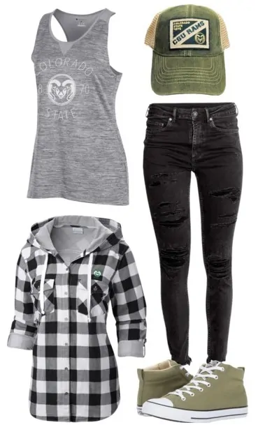Completing the neo-grunge look are black distressed jeans and Converse in the school colors. Distressed jeans are stylish, have personality, and breathe well in mixed fall weather. Converse are comfortable and go with everything, including the CSU trucker hat that will keep the sun out of your face. Nobody wants a sunburn in their Insta tailgating pics.