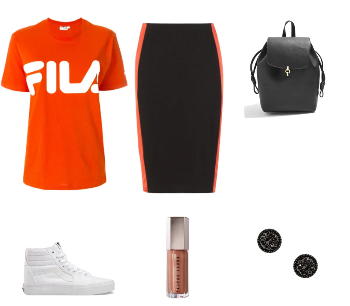 You do not want to overdo it with orange with this set (see our post on how to wear orange for more) so wearing all white high top Vans instead of brightly colored shoes is ideal. Finish the look with minimal accessories and a swipe of Gloss Bomb by Fenty Beauty.