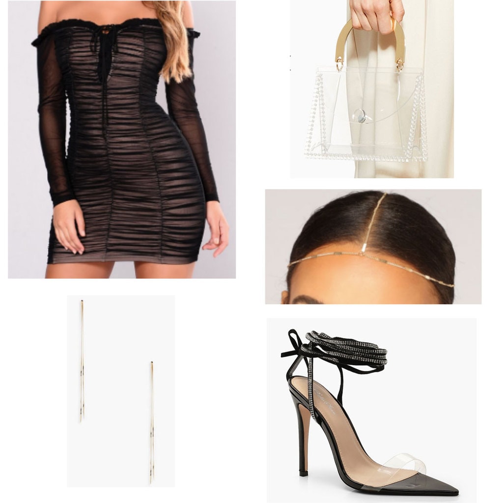 Products: Bodycon Dress – Fashion Nova, Bag – Topshop, Sparkly Headband – Fashion Nova, Earrings – Boohoo, Heels – Boohoo