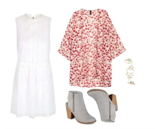 This look would be fantastic for a low-key dinner with someone special before the year ends. The shawl is a light layer that can help keep you warm on those chilly spring nights. The booties have a low heel which makes the outfit a little dressier. Finish off the look with a few stackable rings.