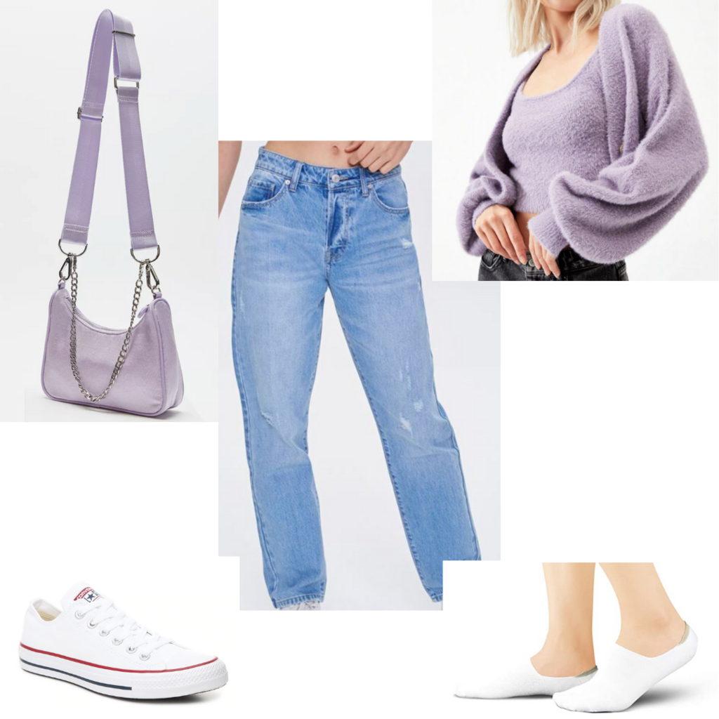 Then, pair the outfit with these white converse and no-show socks to go with them. Lastly, you will most likely want a purse to go with this outfit, so you should use this adorable matching purple purse that has a long strap, which will make it easy to carry around.
