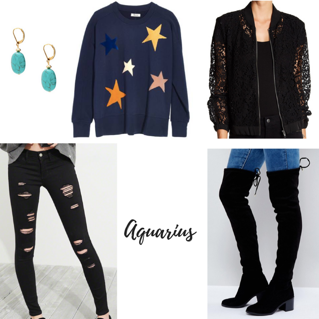 This outfit captures the quirky and cute style Aquarians are known for. The sweatshirt has an adorable starry print which I paired with edgier ripped black jeans. Layer the top under a trendy black lace bomber jacket and add some ever-popular over-the-knee boots. The sweatshirt and jeans continue the laid-back look, while the jacket and boots maintain the fashion-forward vibe. Accessorize with some turquoise earrings to add a pop of color and pick up on the blue of the sweatshirt.