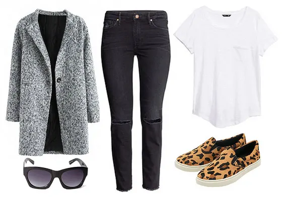 You can’t go wrong with a plain white tee and black skinny jeans. The gray coat and slip-on skater shoes (with a not-so-subtle nod to Harry’s leopard print coat) bring in a street-style chic element, especially when finished off with a pair of shades.