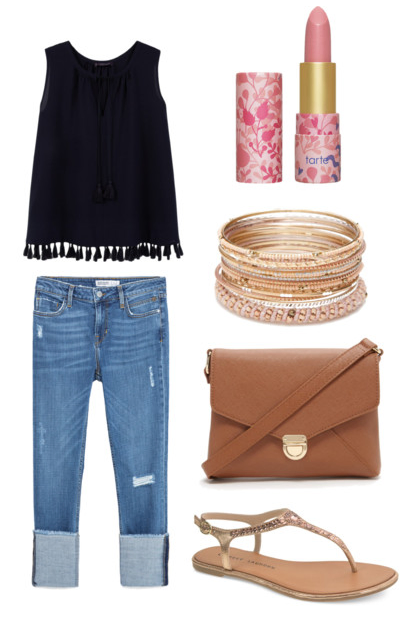 Add in some of that moving moxie with a outfit made for trekking. Sensible jeans and a cute, loose tank look boho-chic with some gold bangles and matching sandals. A crossbody bag keeps your hands free while holding all your essentials and a pop of bright lipstick will have you ready for anything!