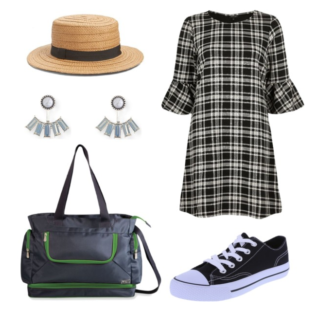 A boater hat and plaid dress capture the spirit of a Mark Twain hero, while a tote bag will carry all your adventuring essentials, from sports gear for the gym to a picnic feast for the park. Sparkly earrings are a nice, trendy touch while these sneakers are both affordable and fashionable.