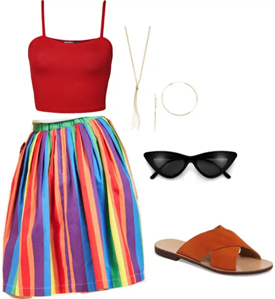This look is inspired by Billie’s birthday party ensemble. (Scroll through the pics above to see her full look in the final photo.) Never one to shy away from a fashion risk, Billie pairs a super bold rainbow skirt with a bright red crop top. This look would be perfect for a summer get-together or spring break!