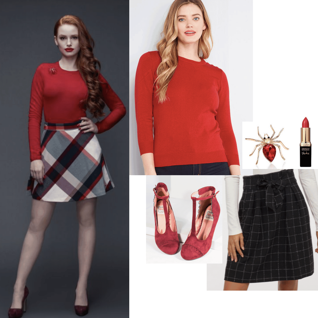 To get Cheryl’s Riverdale High vibe, mix classic pieces like a basic red sweater and a check mini skirt. This might sound simple, but when you add in a few noticeable accessories, such as a spider brooch and statement red heels, your look will be the talk of the school.
