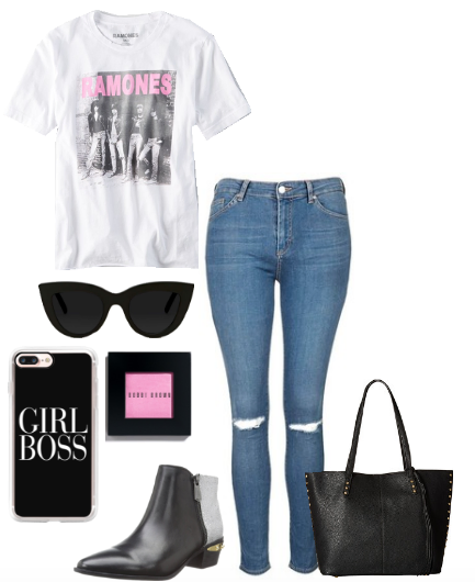 I love the blend of black, white, and neon pink in this Ramones t-shirt from American Eagle. Some simple blue jeans and black accessories make this outfit perfectly casual for class. Black Sam Edelman booties with gold metallic spikes to play up the otherwise casual look are the perfect footwear choice.