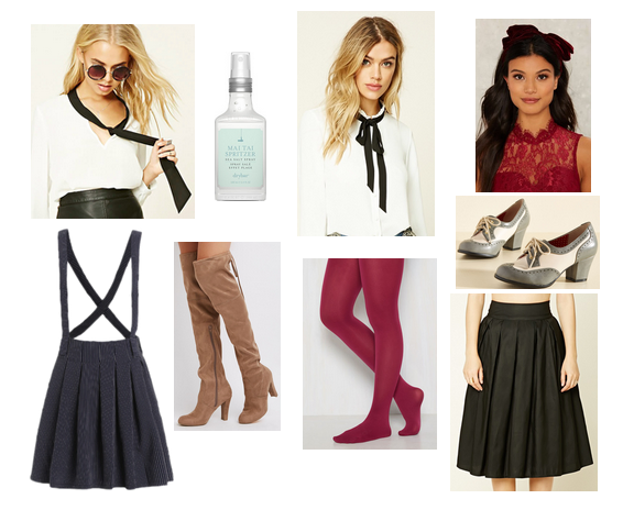 Products: Tie Blouse, Suspenders Skirt, Boots, Sea Salt Spray, Bow Blouse, Tights, Headband, Oxford Heels, Skirt