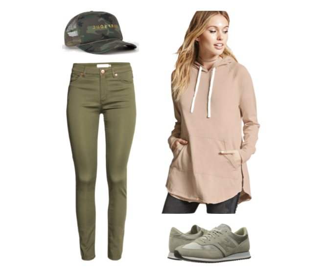 Muted, neutral tones are super in this season, and they make a casual outfit look a bit more fashion-y. Opt for New Balances if Yeezy’s are out of your budget. Finish with a camouflage hat for a messy hair day if needed!