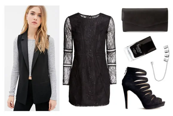 Start with a feminine black lace dress, paired with a tailored, menswear-inspired vest. Accessorize with edgy black heels, a simple black clutch, black nails, and a hint of silver with a trendy ear cuff.