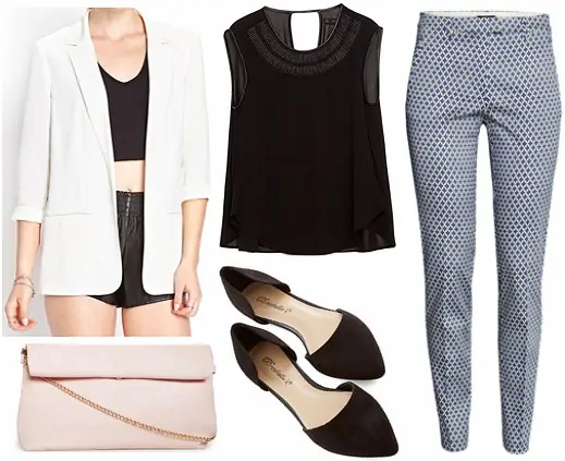 A blazer adds a sophisticated touch to any outfit, and when paired with these fun printed slacks, you’ll look a modern and chic! This black top with an embellished collar and pointed flats are neutral yet eye-catching pieces, and you can carry all of your important things in a large dusty pink clutch bag.