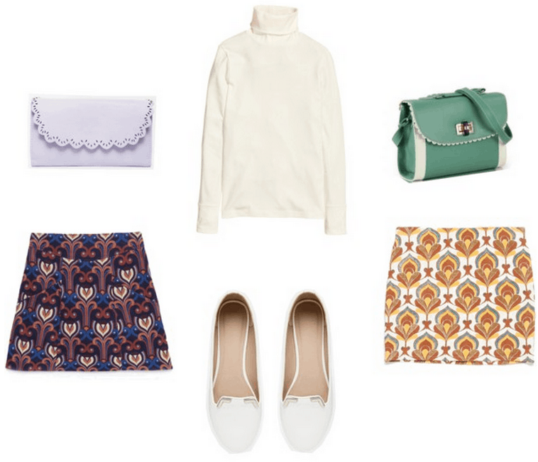 This last outfit takes inspiration from the dense pattern of flowers toward the top of the painting. Depending on your preference, this outfit can either swing warm-toned or cool-toned. A simple white turtleneck creates the perfect base for these loud, patterned skirts from Zara. Opt for white loafers instead of white ballerina flats for a more trendy vibe.