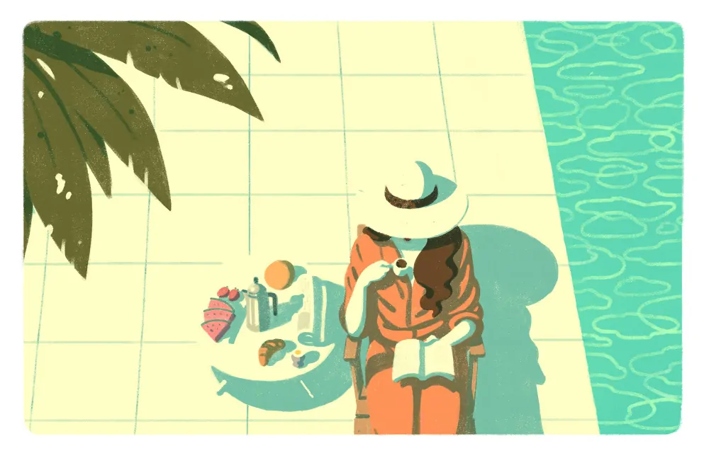 This first set of illustrations depicts a romantic resort vacation. I love the figure’s flowing, jumpsuit-like outfit in the bottom illustration.