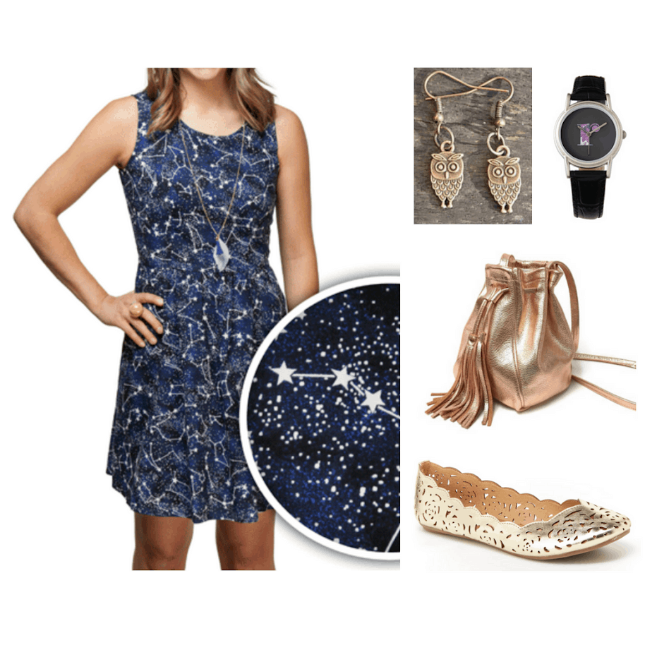 This outfit can work for pretty much anything. You can wear it to lunch, for a shopping trip, or even for a casual date. It’s not your typical everyday outfit, but, then again, creative Ravenclaws are anything but typical. Not only does it portray Ravenclaw’s colors, but it also includes a (glow-in-the-dark!) dress covered in stars to look like the night sky, just like the ceiling in the Ravenclaw Common Room. I also included a cute watch with the letter “R” to show House pride, and bronze owl earrings, since Ravenclaws are known for being wise.
