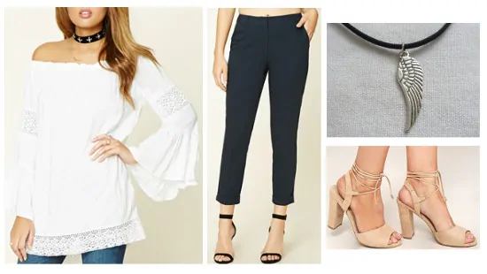 Although Pegasus is depicted in art as being all white, I introduced some navy into this outfit as a nod to Poseidon. The central element here is the white tunic with long bell sleeves (which are pretty similar to wings if you ask me). Pair it with navy trousers and add a pair of nude block heels. Finally, accessorize with a wing necklace.