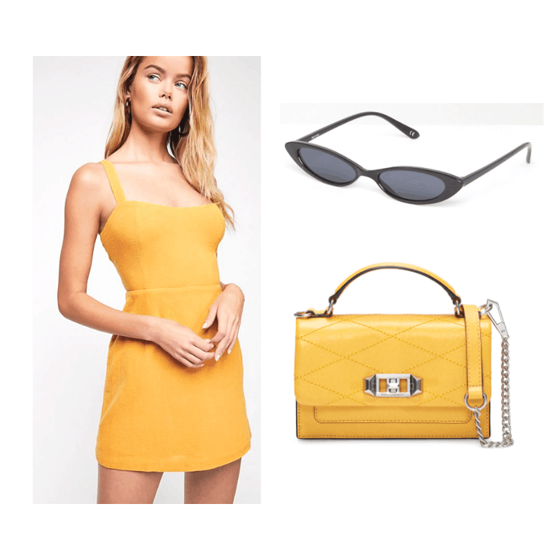 Get this cheerful look with a bright and tropical dress, preferably one in orange or yellow to replicate the sun-vibes. Next, match whatever color dress you chose to a clutch, and throw on your favorite pair of shades (I love Kourtney’s slender cat-eye sunglasses). Keep in mind that the idea behind this look is beach-y and vibrant, so pick sandals or heels to show some toe!
