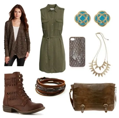 Hiccup wears a simple outfit consisting of an olive tunic, brown fur vest, leggings, and furry boots. The earthy color palette is perfect for the upcoming back-to-school season. A shirtdress is a natural foil for a cozy brown cardigan and rugged boots. Accessorize with a rope and leather bracelet reminiscent of the harness that Hiccup builds for Toothless and a trendy spiked necklace.