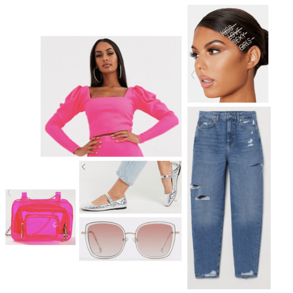 Add some pink to the look as well with a cute ’90s-inspired bag. And don’t forget to grab some pink glitter hair clips to add a psychedelic aesthetic to the look.